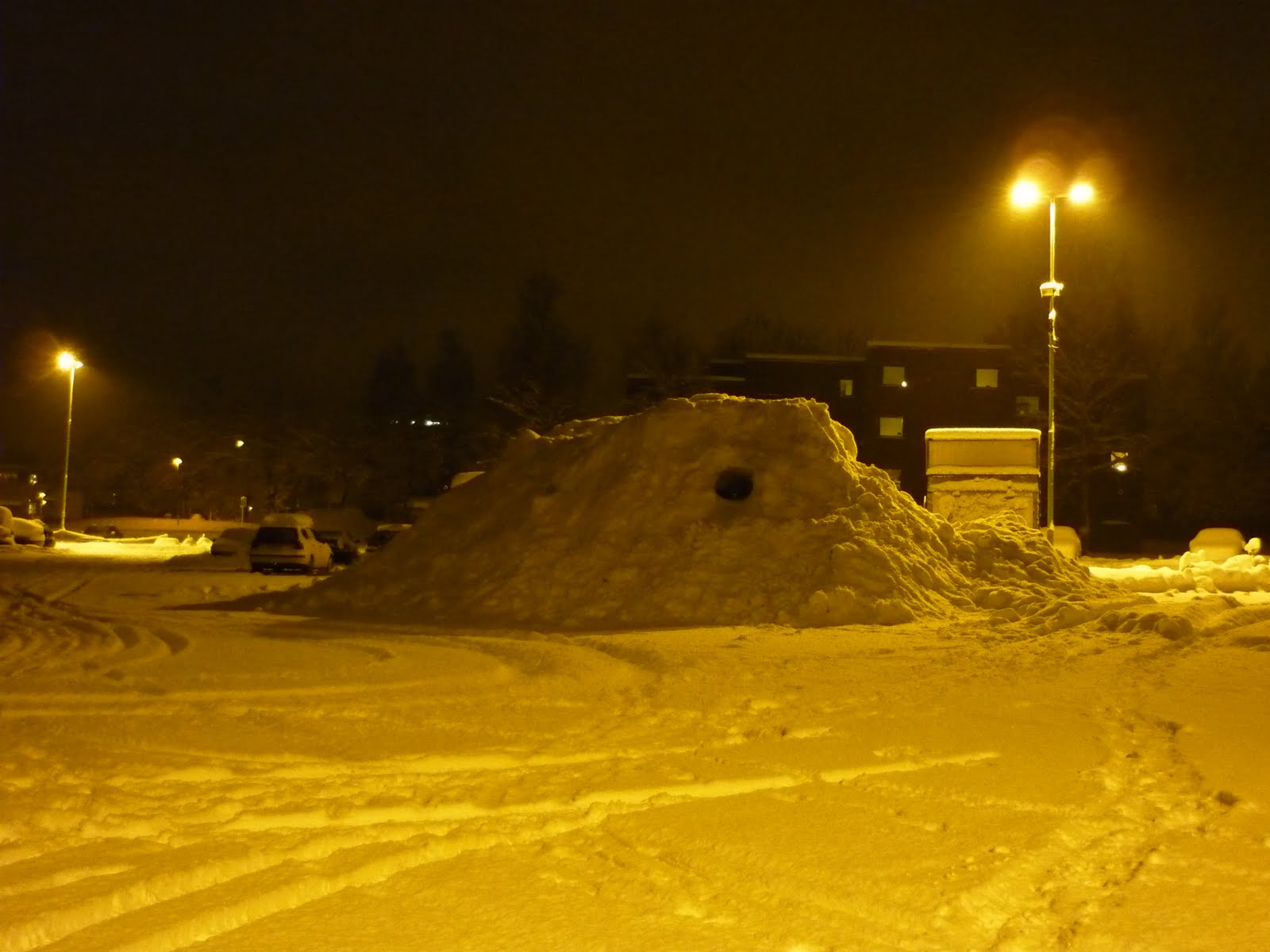 And the accumulated snow then serves as basis for children to built great snow caves. A small boy disappeared in the hole in the middle of the hill just when I took the picture.